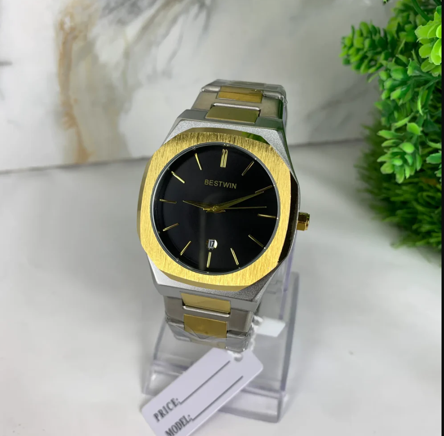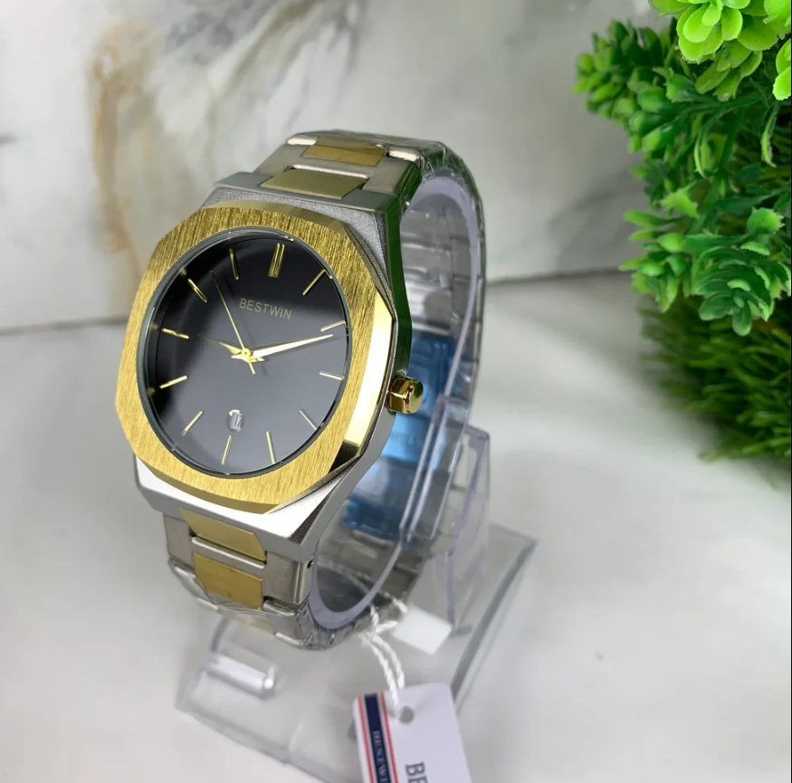 - Dial & Features: It boasts an elegant black, octagonal dial with a minimalist design, featuring gold-toned hour markers and hands, and includes a practical date display window at the 6 o’clock position.