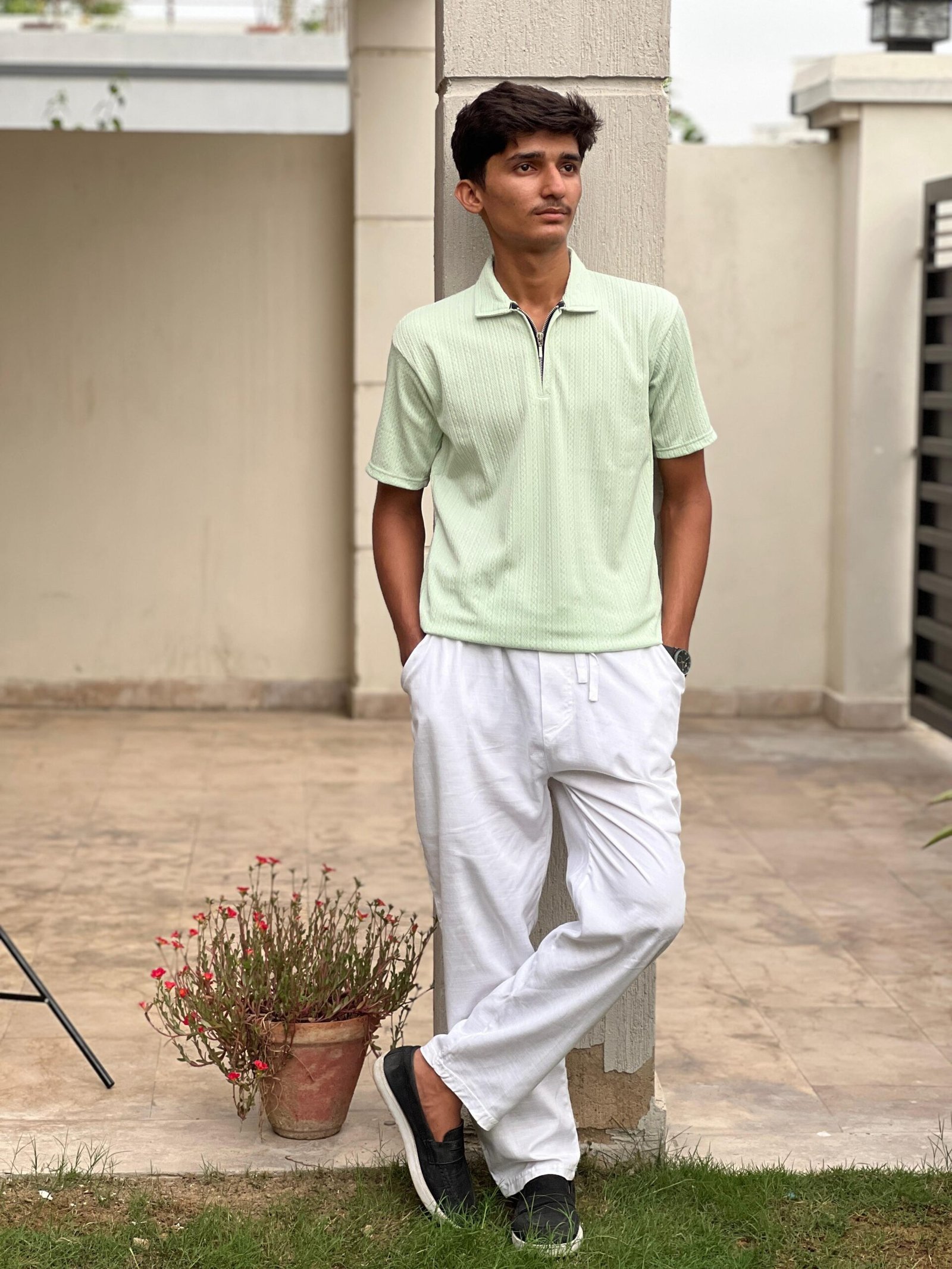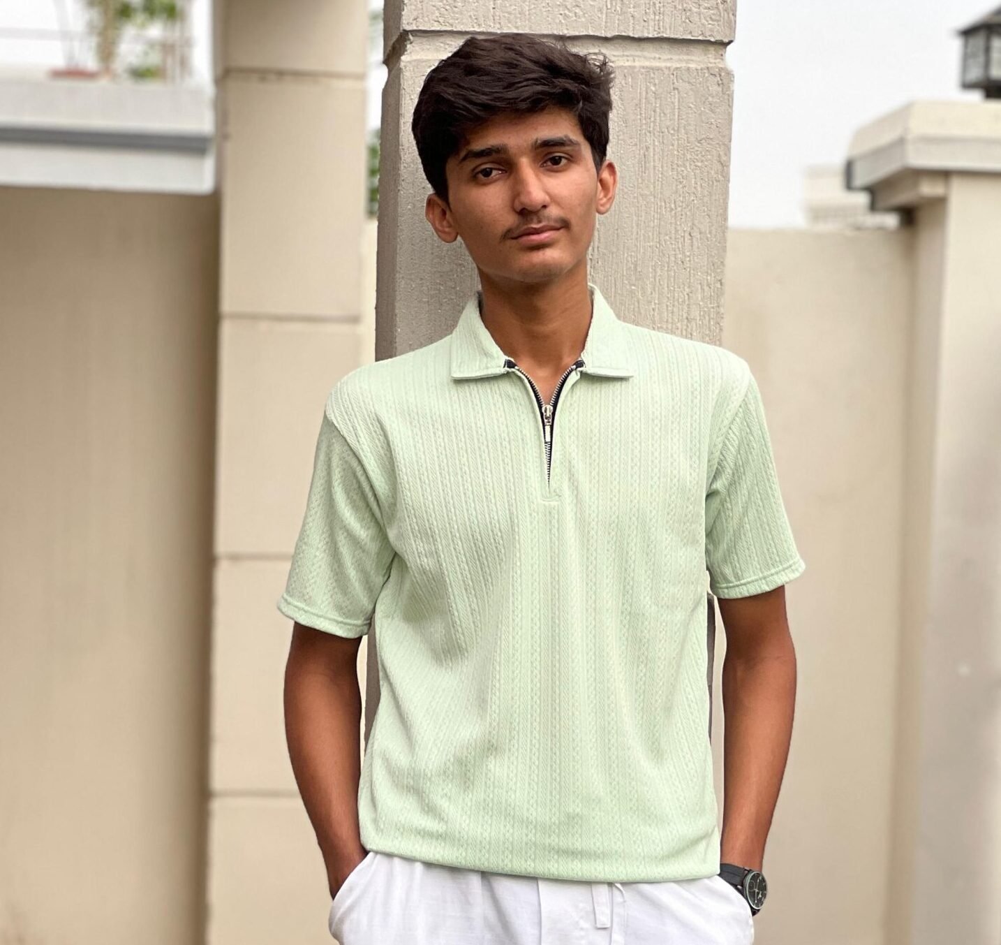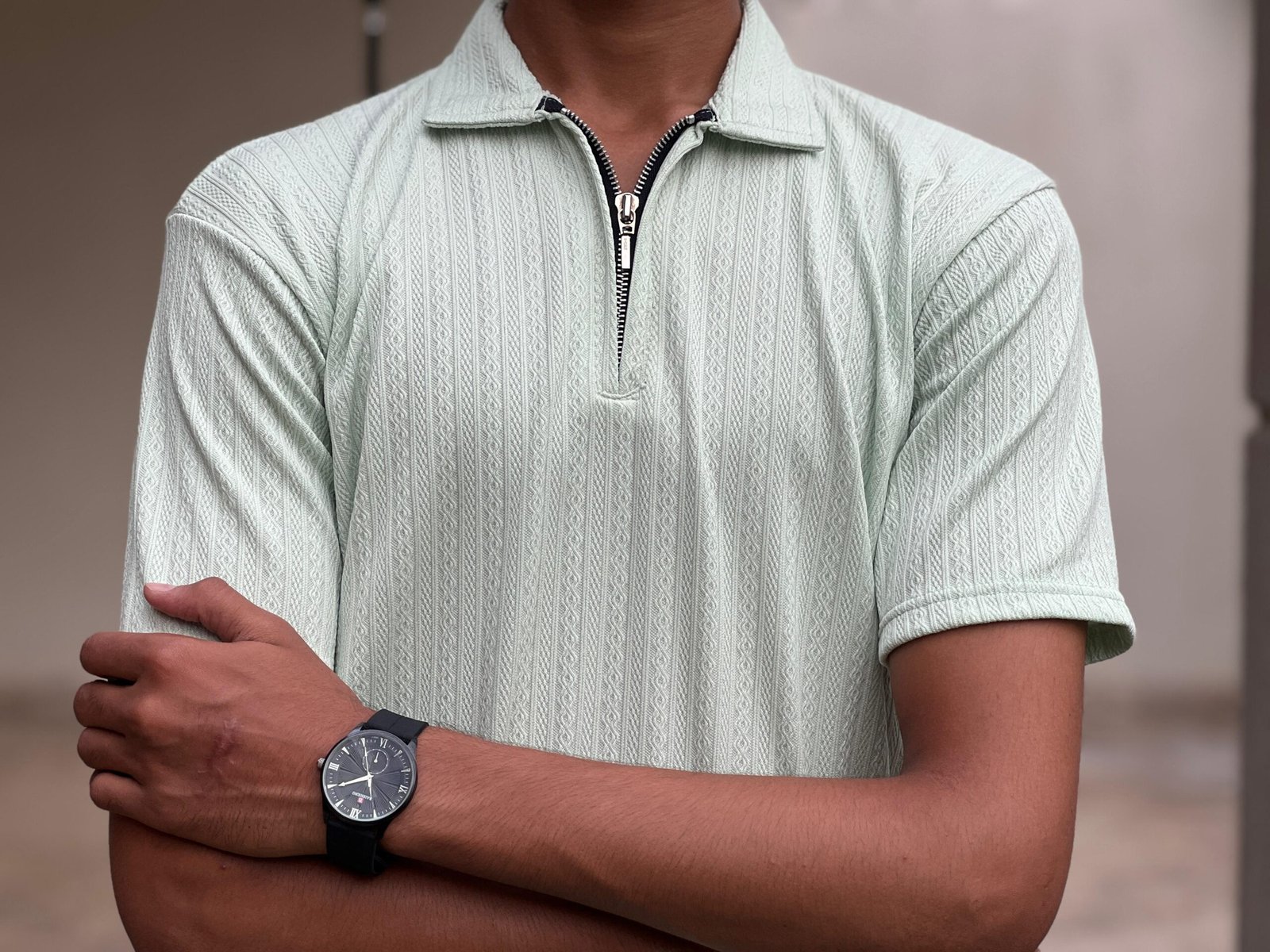 • Type: It’s a men’s polo shirt, characterized by its collar and short sleeves, but with a modern twist of a zippered placket instead of traditional buttons.