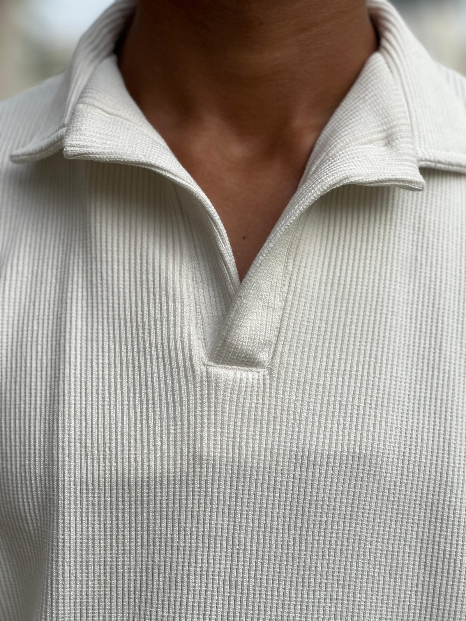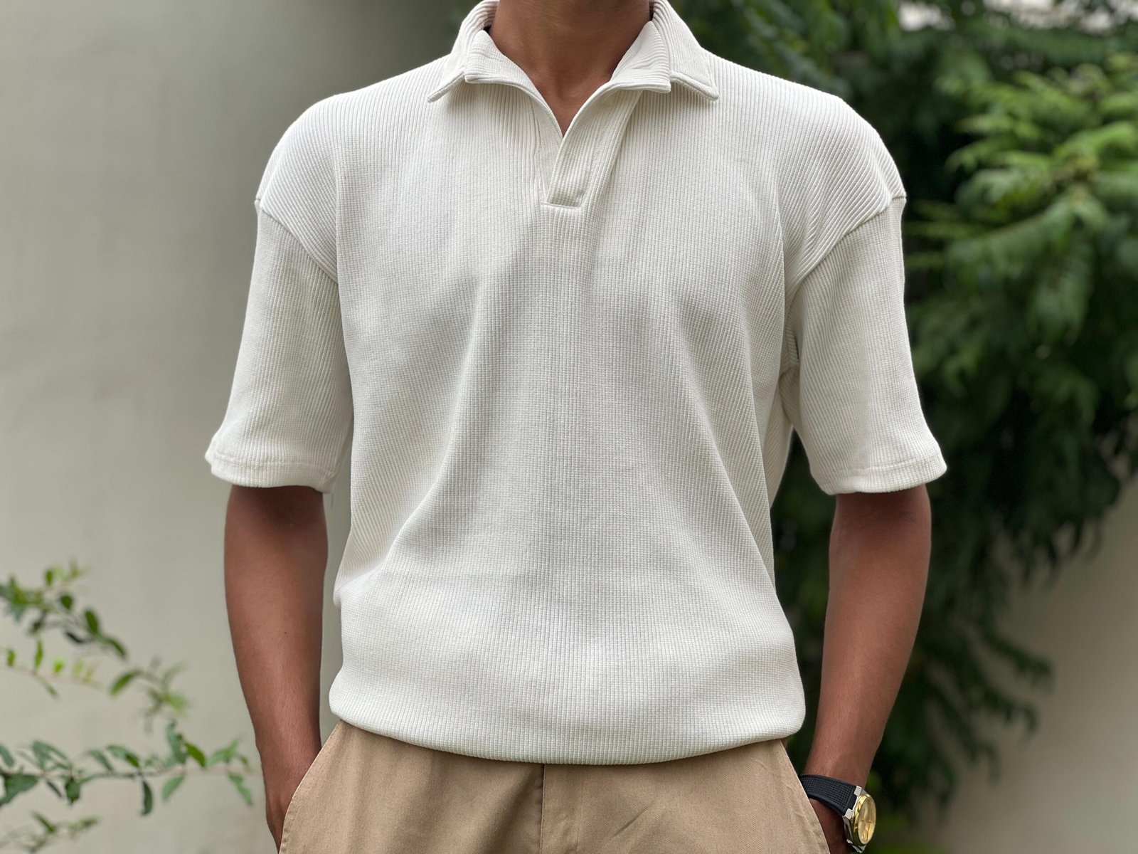 - Style: It features a classic polo collar with a short, open V-neck placket, distinguishing it from traditional buttoned polos.