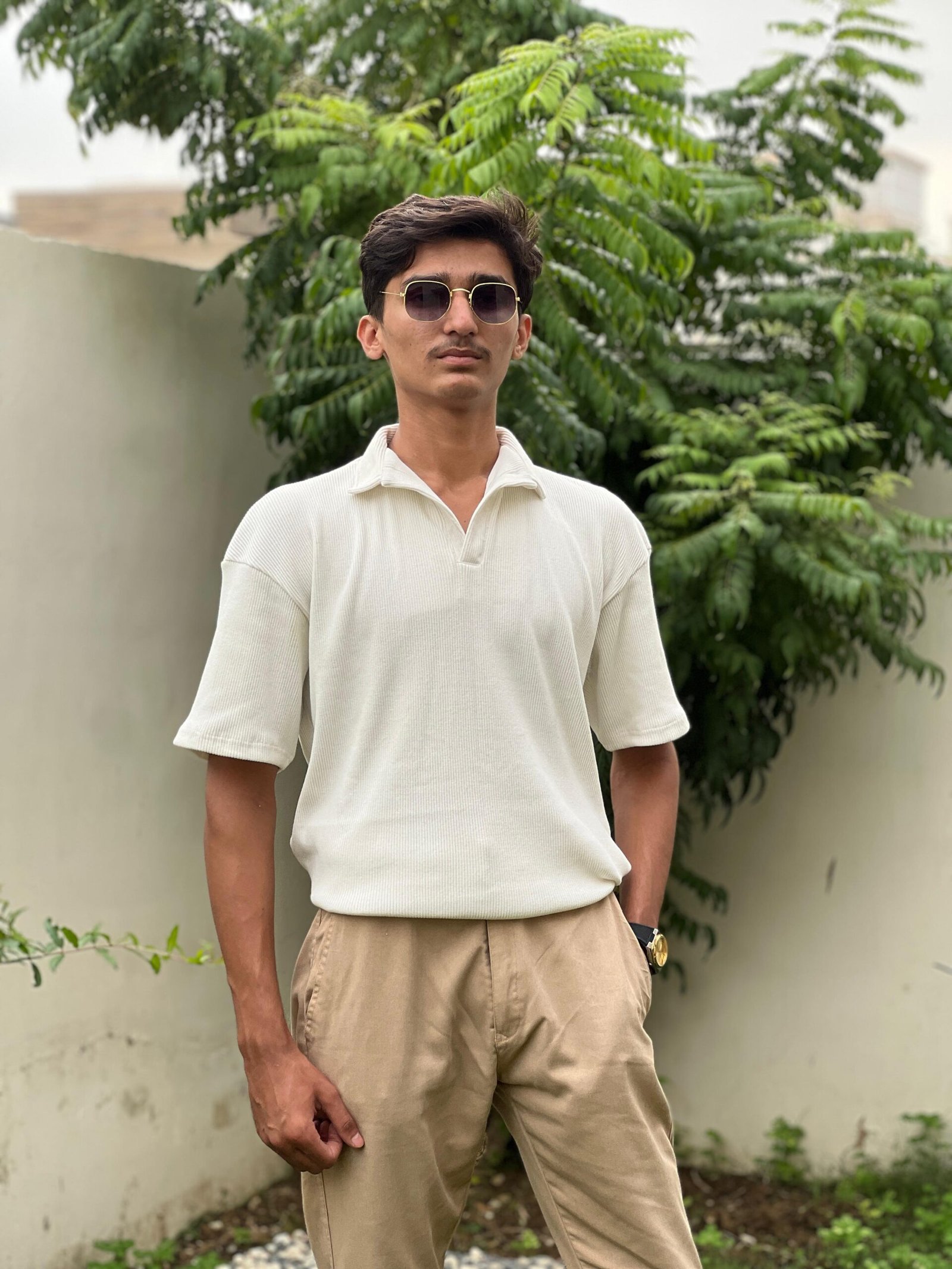 - Color: The shirt is in a light, neutral shade, often referred to as off-white, ecru, or cream, which lends itself to versatile styling