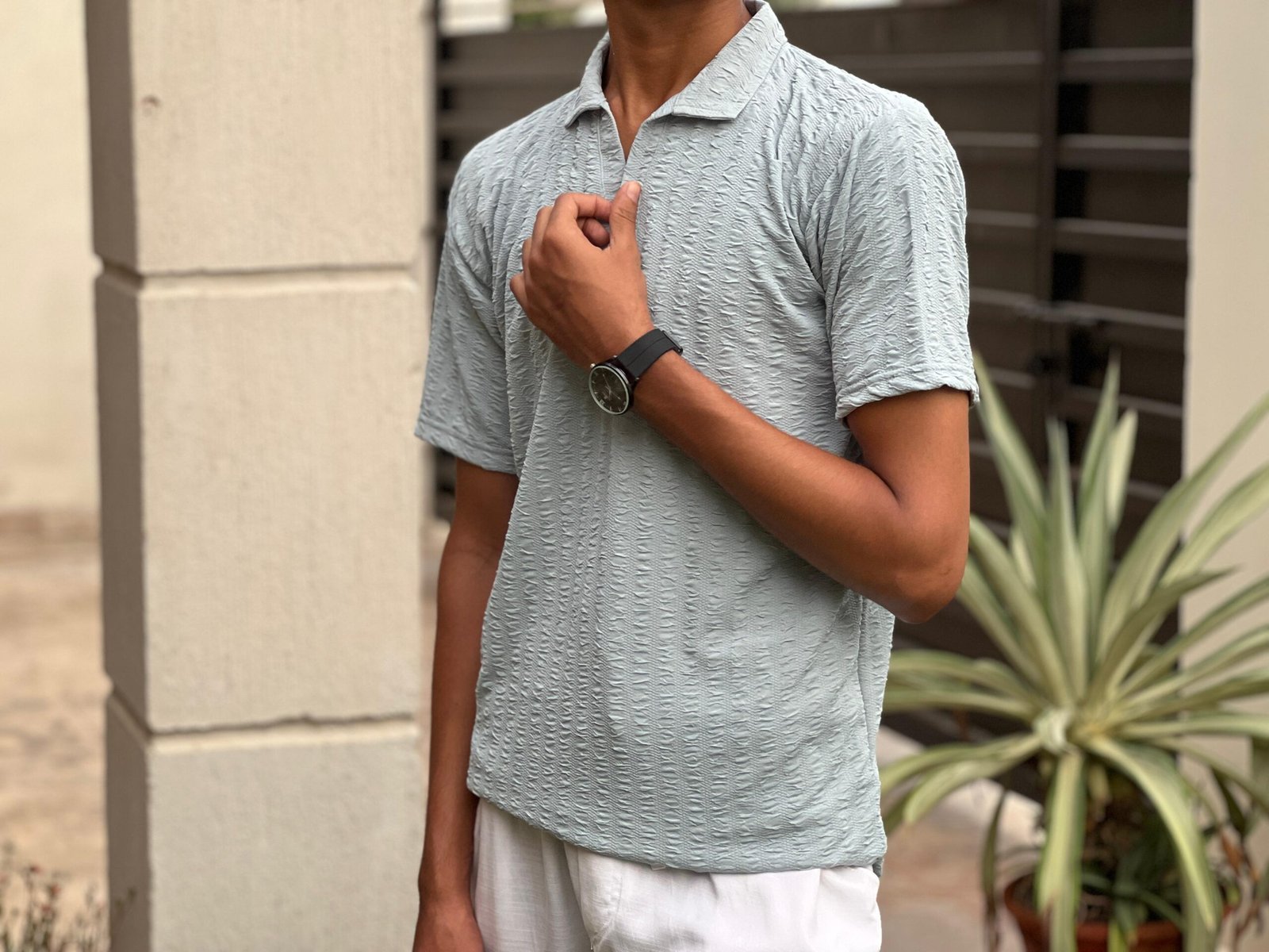 Elevate your everyday style with our textured light grey polo shirt, the perfect blend of sophistication and comfort. Crafted from a lightweight and breathable fabric, this shirt ensures you stay cool and confident all day long. Its subtle 3D woven pattern adds a touch of character to the minimalist design, making it a wardrobe essential for those who appreciate both fashion and functionality.